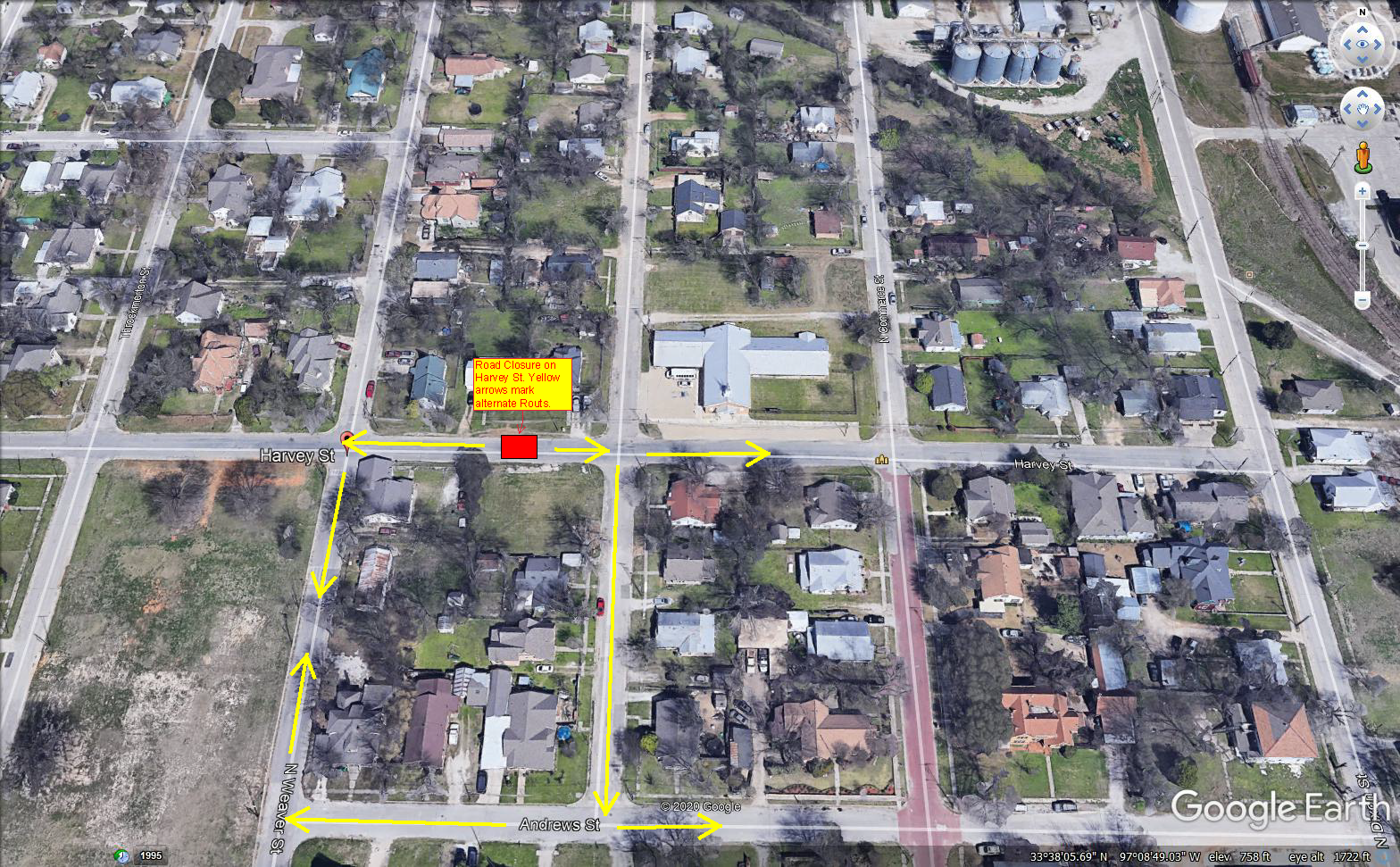 On Wednesday March 4, 2020, from 8:00 a.m. to 1:00 p.m., Harvey St. at Witherspoon will be closed to thru traffic for construction. Alternate routes shown on attached map, expect delays in this area during that time. We apologize for any inconvenience. If you have any questions please call the Public Works Department at 668-4540.